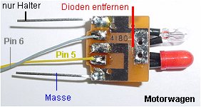 eingelötet sind. Die Zuleitung zum Decoder gelb an Pin 5 und grau an Pin 6 weiß.