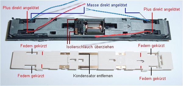 Links im Bild der Motorwagen ohne Kondensator. Federbleche sind gekürzt und Litzen an die Drehgestellpins angelötet. Die