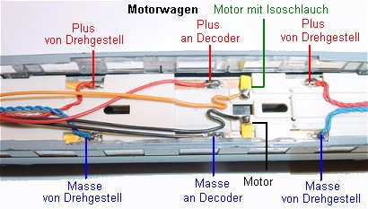 direkt an die Drehgestellpins angelötet und durch zwei Löcher nach oben geführt wie im Motorwagen beschrieben. Die