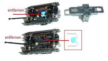 mit Platine geändert, und in beiden Drehgestellen je ein Kondensator eingebaut. Alle drei Kondensatoren müssen entfernt werden,