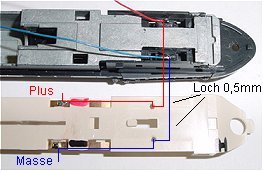 Stromverbindung nochmals hergestellt. An die gleichen Lötpunkte werden die Decoderkabel angelötet. Oben Plus an Pin 4 und