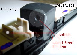 nach hinten zum Steuerwagen geFührt werden müssen, bohrt man seitlich in den übergang zwischen den Wagengehäusen ein Loch 1,5