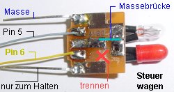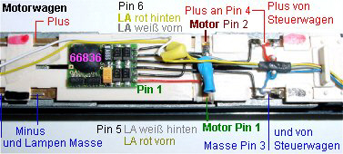Pin 5 wird die rote Lampe vom Motorwagen und die weiße Lampe vom Steuerwagen angeschlossen. An Pin 6 die rote Lampe vom