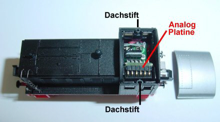Das Dach wird nach oben aus den Haltebuchsen gezogen. Die Schnittstelle wird sichtbar und hier wird die Analogplatine