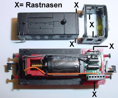 Bei X sind die Rastnasen von Führerstand und Motorvorbau zu sehen. Der Motorvorbau wird nach vorne oben abgenommen.