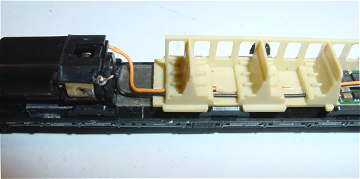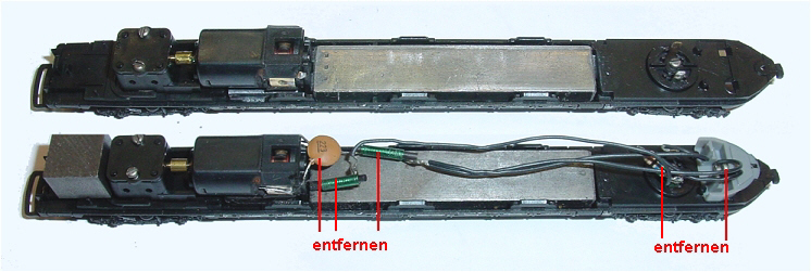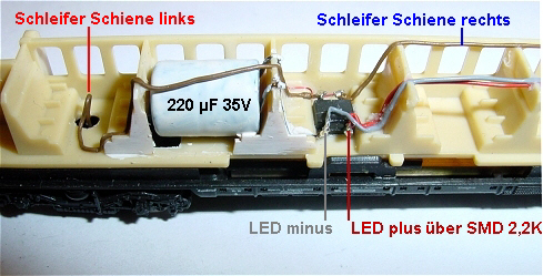 Oben im Bild ist alles abgelötet. Der Motorwagen hat Stromschleifer vorne, der Steuerwagen nicht. Hier muß man sich zur Stromabnahme