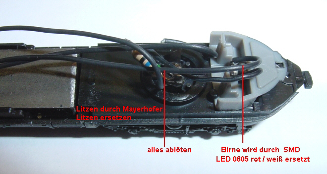 da der Zug nur mit Motorwagen vorn betrieben wird. Im Steuerwagen ist logischerweise dann nur eine rote LED. Der Tausch Birne