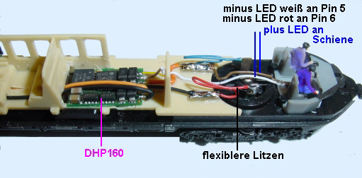 Umbauanleitung: Hier mit einem DHP160 SX - SX2 - DCC Decoder im Motorwagen und roter Schlussbeleuchtung im Steuerwagen.