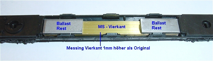 Das Ballastblech ist durch Messingstange ersetzt welche 1mm höher als das Original ist. Vom Original wurde je ein Stück