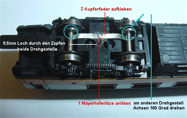Eine Kupferfeder (z.B. Bavaria) bekommt eine Litze angelötet. Die Achsen werden herausgenommen und die Feder wie im Bild aufgeklebt.