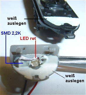 Wie am Motorwagen wird die rote LED mit Vorwiderstand eingeklebt und die Litzen durch das Lampenloch geFührt.