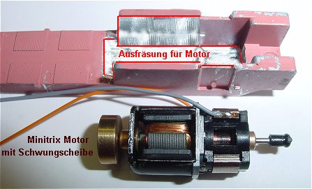 Da der Originalmotor kaputt war und kein Ersatz zu bekommen, wurde die Motorhalterung aufgefräst und an einen Minitrixmotor