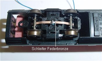 Da der Mittelwagen keine Stromabnehmer hat muss man sich welche anfertigen. Ein Drehgestell linke Schiene und eins rechte Schiene,