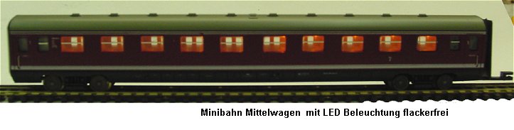 Der Mittelwagen ist fertig. Im Dach die flackerfreie LED Beleuchtung, der Stützkondensator wurde in die Toilette unsichtbar
