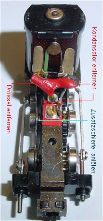 Alle Entstörteile werden abgelötet. Dabei ist es einfacher, den Motor auszubauen, da die Motorkohle Halterungen