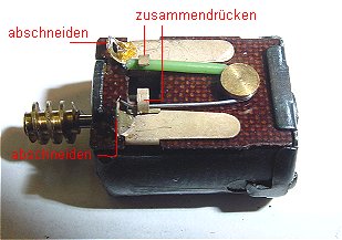 Die Kohlehalter werden ausgehängt und die Rundung der Stahlfeder Halterung etwas flacher gedrückt. Die Lötaugen
