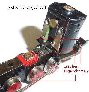 Kohlehalter geändert und Lötaugen des Plus- und Massekontaktes bis auf 1 mm abgeschnitten. Platz vor dem Motor