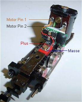 Decoder DHL050 ist aufgeklebt. Orange von Pin 1 an Motorblech links im Bild. Grau von Pin 2 an Motorblech rechts.