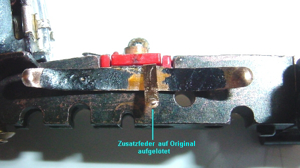 Teilfeder wird auf die Originalschleiffeder über der Mittelachse aufgelötet. Man kann sich nur wundern wie