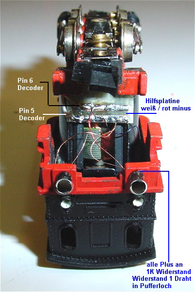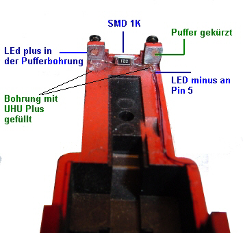 vorne innen zwischen die Puffer geklebt wird. Vom Widerstand einen Draht in einem Pufferloch festklemmen. Minus