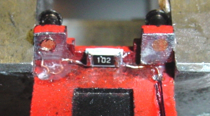 Nochmal etwas größer, Der Widerstand ist auf ein Stück Papier als Isolierung geklebt.