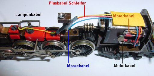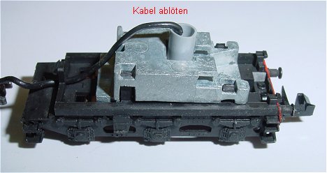 Am Motor werden zwei Kabel angelötet, orange oben, grau unten und zum Tender verlegt. An der Gehäusehalterung