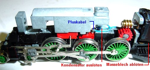 Kondensator auslöten und unter dem Motor das Masseblech, welches an der unteren Motorkohlehalterung angelötet