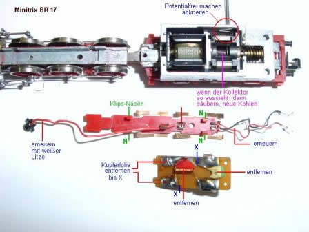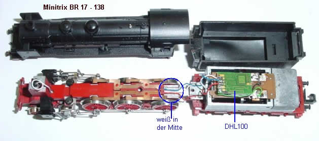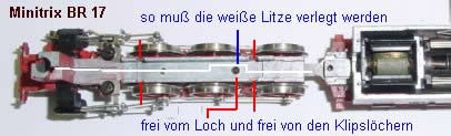durch weiße Litze ersetzt welche bis zum Tender reichen muß. Dann Lampe wieder einsetzen und die weiße Litze