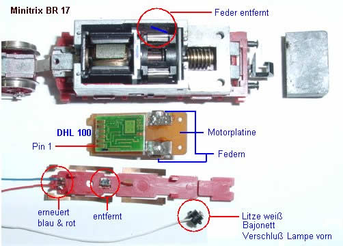 Im Bild ist der Pin 1 des Decoders unten, hier wird eine schwarze Litze angelötet und mit der Feder oben verbunden.