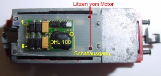 Tesa-Doppelklebeband befestigt. Die beiden Litzen vom Motor werden an Punkt 1 und zwei des DHL100 gelötet.