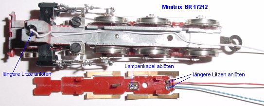 wird die rote Halterung der Stromabnahmefedern aus dem Lokunterteil ausgeklippst. Das Lampenkabel wird abgelötet