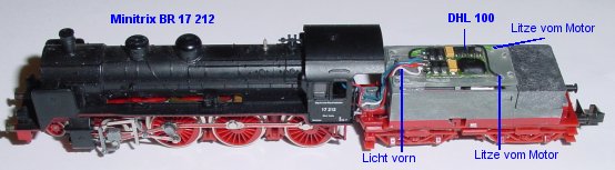 Lokgehäuse wieder aufsetzen und Tender anschrauben. Verkabelung wie folgt: Blau an Pin 3, im Bild von oben nach