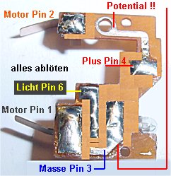 sitzt. Pin 5 weiß an Lampe vorne und Pin 6 gelb an das mittlere der unteren Lötpads.