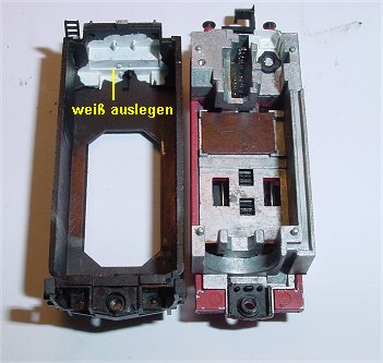 Die Lichtleiter werden herausgenommen und wie im Bild an der Tenderrückwand weiße Farbe aufgebracht. Zur