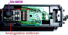 Die Analogplatine wird aus der Buchsenleiste herausgezogen und durch den Trix 66836 ersetzt.