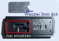 In den Kohleaufsatz passt ebenfalls ein Stück Walzblei, welches man nach den Massen der Öffnung zuschneidet.
