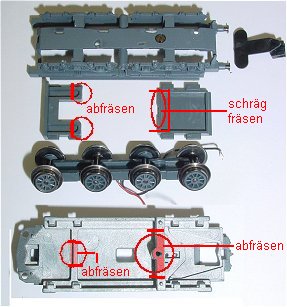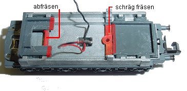 mehr bändig auf das Unterteil. Gut zu sehen: Die Litzen aus der Kuppelstange sind gekürzt und am Decoder verlötet.