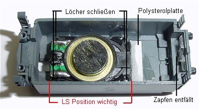 eingeklebt wurde. Der LS Korb wärde sonst mit den 4 braunen Kondensatoren kollidieren und das Gehäuse ginge nicht