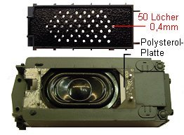 Vor dem Einkleben des Lautsprechers werden ca. 50 Löcher mit 0,5 mm Durchmesser gebohrt damit der Schall nach oben