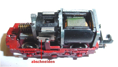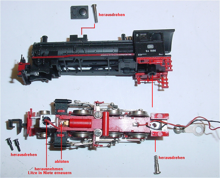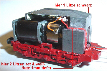 Schwarze und rote Litze wird abgelötet und durch die beiden Litzen vom Tender ersetzt. Bajonetverschluß der