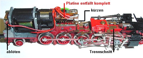 Das Ballastgewicht herausziehen. Die Platine entfällt. Beide Federn vorn von der Platine ablöten. Die im Bild