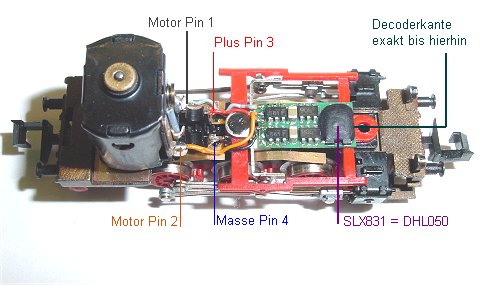 Der Decoder ist aufgeklebt. Wichtig ist der Abschluss rechts. Genau an der verlängerten Linie des roten