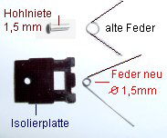 Hier sieht man die neue, flacher eingesetzte Feder im neuen Rohrniet. Hier sind noch beide FederHälften isoliert,