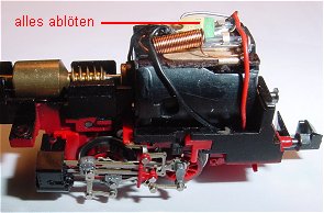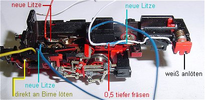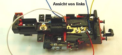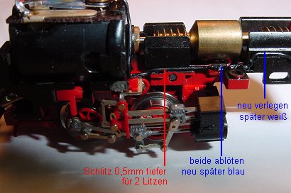 Im Bild ganz rechts der Schlitz der DrehgestellFührung. Die beiden schwarzen Litzen in der Mitte ablöten.
