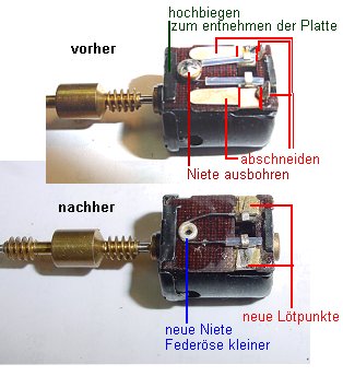 Auch der Motor muss bearbeitet werden um 1mm Platz zu gewinnen. Dazu erst alle Entstörteile ablöten. Dann linke