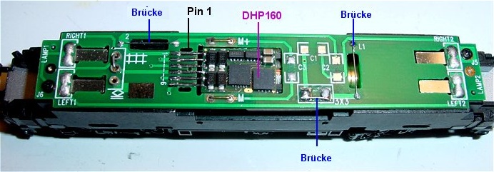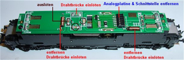 Umbauanleitung: Es passt ein DHP160Gehäuseseitenwände leicht spreizen und Gehäuse nach oben abheben. Analogplatine herausziehen. Platine bearbeiten. Beide Drosseln auslöten und durch Drahtbrücken ersetzen. über den Polyswitch eine Drahtbrücke löten. 3 Kondensatoren auslöten. Bild von der Gegenseite, drei brücken eingelötet. Da die Schnittstelle immer wieder Probleme mit der Kontaktsicherheit der Decoderdrähte macht löte ich die Decoder grundsätzlich ein. Dazu wird der jeweilige Draht mit einer spitzen Pinzette zur wärmeableitung angefasst und dann aufgelötet. Copyright Hinweis