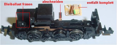 Die kleine Platine entfällt komplett. Die Räder mit Blindwelle werden ebenfalls herausgenommen da später ein
