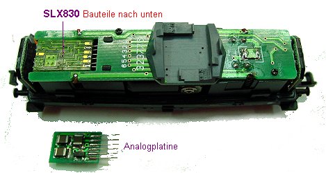Umbauanleitung: Es passt ein Selectrix 66830/DHL100/SLX830 oder ein DCC DHL160/SLX870 in die Schnittstelle.Hier das Foto der Schnittstelle mit eingebautem SLX830 für die Modellbahner, die auch bei Schnittstellen Loks Probleme haben.