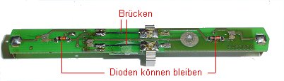 Die Dioden können drin bleiben, denn sie sind nach dem Umbau ohne Funktion. Zwei Drahtbrücken werden eingelötet.