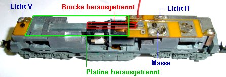 die Lampe vorn. Das heraus zu trennende Stück sollte 2mm größer als die Decoderlänge des 66832 sein, also 40 mm.